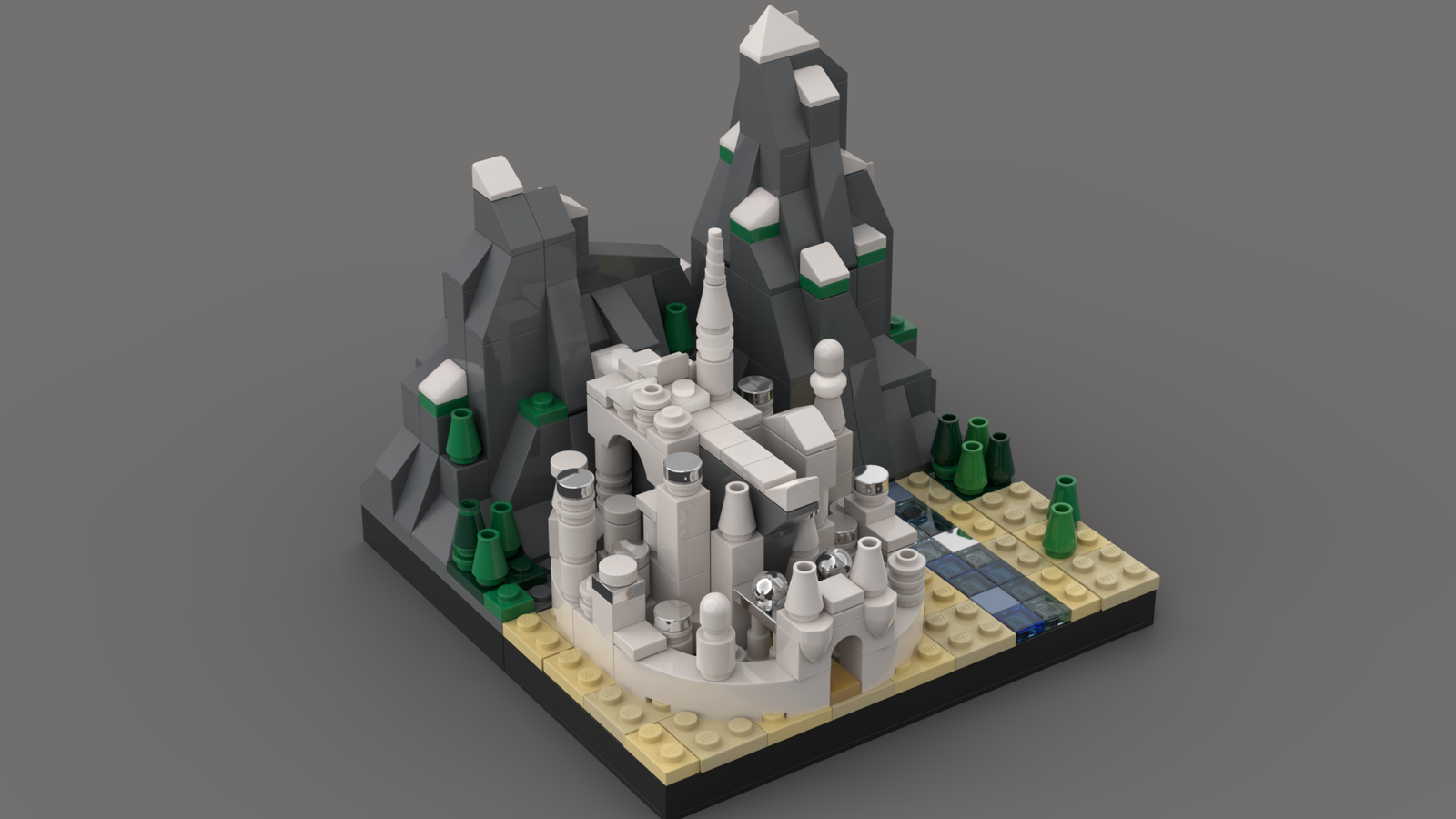 This build is made out of seven different layers, the top layer containing the white tree of gondor and the citadel of minas tirith, the second, third, fourth and fifth layer have a gate, gates get smaller the.